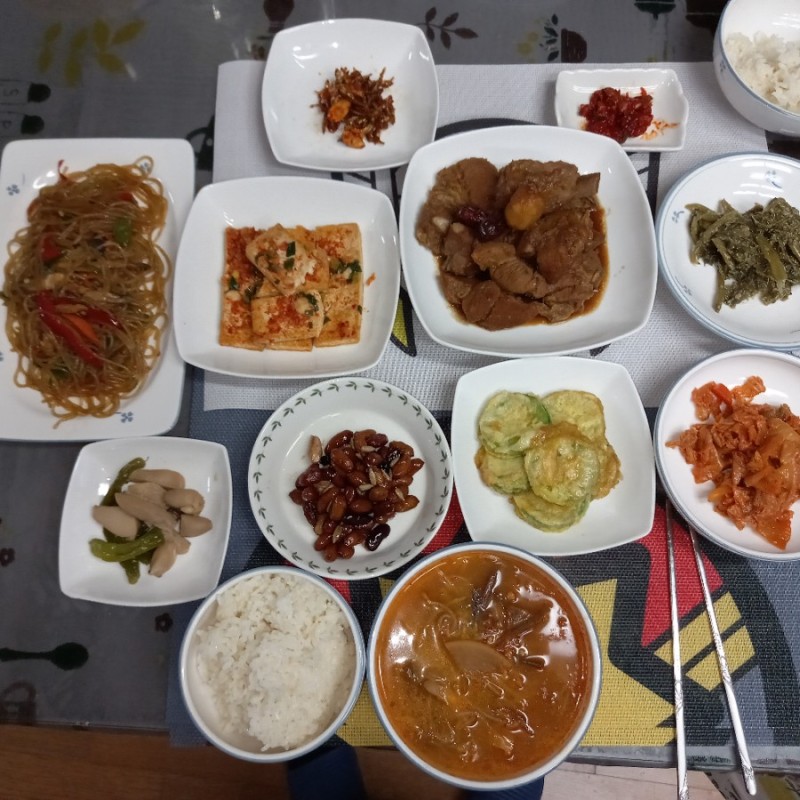 메인 반찬의 양을 보세요!저희 둥평이 좋아하는 잡채와 제육볶음이 아주 맛있게 담겨있습니다.